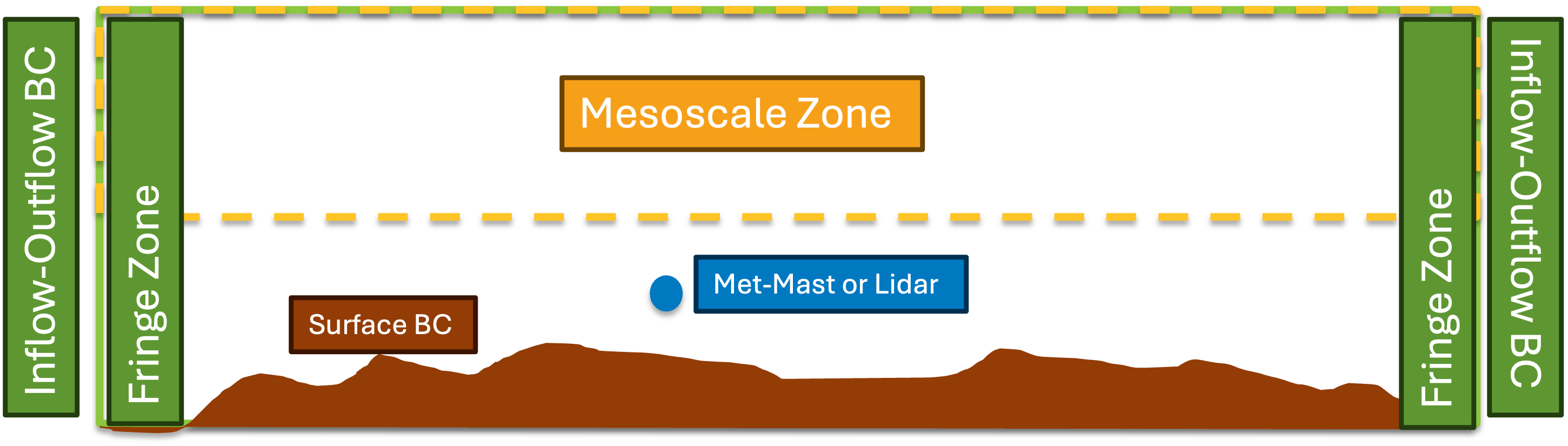 Mesoscale Zone: The velocity, temperature and turbulent kinetic energy is smoothed to the externally specified profile above the approximate height of the boundary layer.