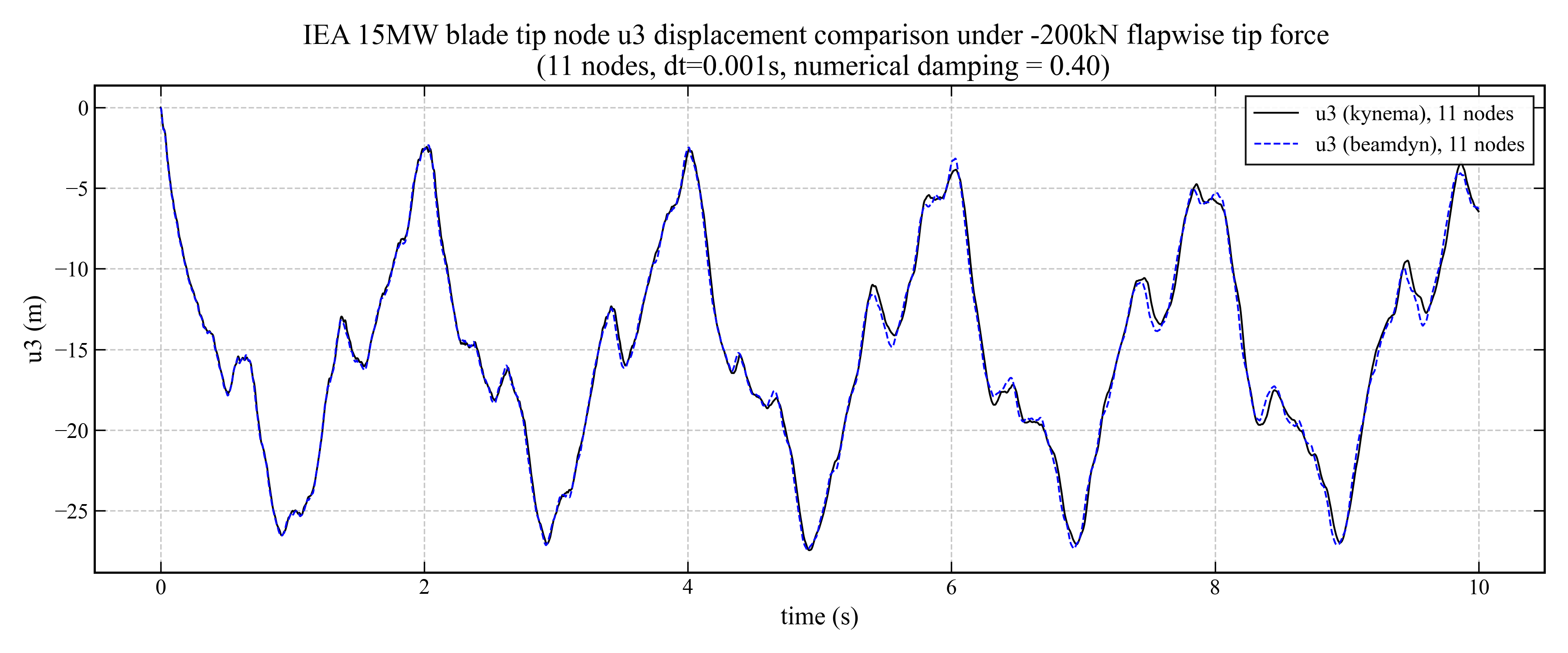 9 Comparison of tip flapwise displacement (\(u_3\)) for the IEA 15 MW reference blade between Kynema and BeamDyn for a single LSFE model with \(n = 11\) nodes under a tip load of \(-200\) kN, with a time-step size of \(\Delta t = 0.001\) s.